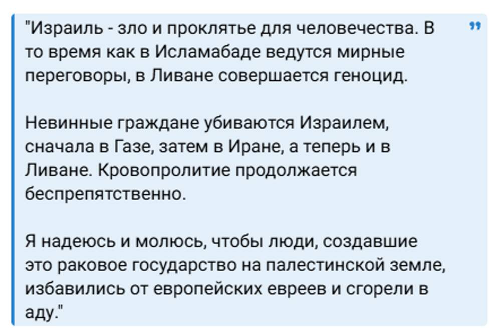 Министр обороны Пакистана на линии:Текстом:"Израиль - зло и проклятие для человечества. В то время, когда в Исламабаде ведутся мирные переговоры, в Ливане совершается геноцид.Невинные граждане убиваются Израилем сначала в Газе, затем в Иране, а теперь и в Ливане. Кровопролитие ... Далее