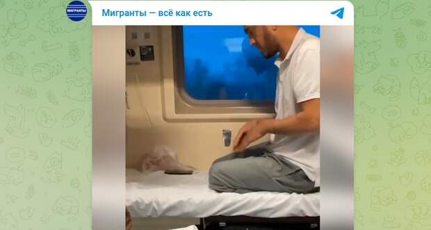 На кадрах – плацкартный вагон. На нижней полке боковой полке, в тесном пространстве поезда, сидит бородатый "специалист" с южными корнями. Он с трудом упаковался на узкую полку, опустился на колени и, как пишет женщина, "начал громко молиться, пугая детей".