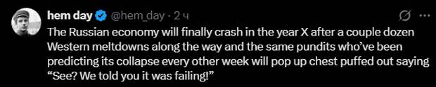 Российская экономика, наконец, рухнет в году X после пары десятков западных кризисов на этом пути, и те же самые эксперты, которые предсказывали ее крах каждую вторую неделю, будут выпячивать грудь и говорить: “Видите?