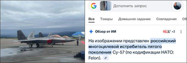 Например, поисковик Google в ответ на запрос пользователя идентифицировал американский истребитель F-22, стоявший на авиабазе на Аляске, как наш Су-57.