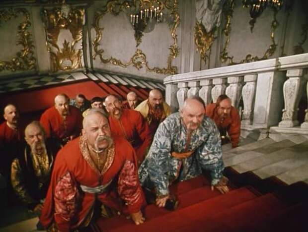 Более 250 лет тому назад. Запорожцы. На коленях. Красная дорожка. Лестница. Русская государыня.
