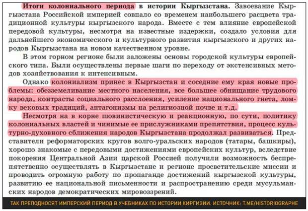 Как отмечал недавно министр просвещения Сергей Кравцов, преподавание в школах Средней Азии ведётся по их национальным программам. Игорь Маслов в интервью "Вечернему Бишкеку" сказал, что в построенных на наши средства школах будут преподавать "по российским стандартам". А какой у нас стандарт истории Киргизии? Идеологическое наполнение гуманитарных курсов определяют власти КР. Что написано у них в учебных программах, широко известно. Российская Империя и Советский Союз прямо называются "колониальными угнетателями", восстание с резнёй русского населения в 1916 году — "национально-освободительной борьбой", басмачи — национальными героями.