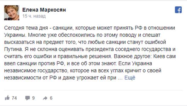 Сегодня тема дня - санкции, которые может принять РФ в отношении Украины. Многие уже обеспокоились по этому поводу и спешат высказаться на предмет того, что любые санкции станут ошибкой Путина. Я не склонна оценивать президента соседнего государства и считать его ошибки и правильные решения. Важное другое: Киев сам ввел санкции против РФ, и все об этом знают.