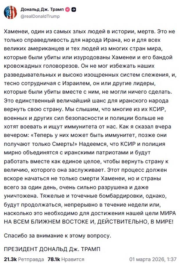 Получается, в условиях, когда о грядущем мощном ударе не говорил только ленивый, а эксперты всего мира обсуждали главную пропагандистскую цель президента США Дональда Трампа – убийство именно аятоллы – сам он вместе с близкими даже не переместился в какой-нибудь бункер, а находился в рабочем кабинете, как будто за окном не 2026-й год.