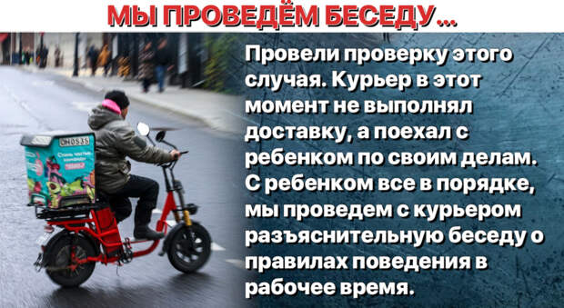 После широкого резонанса в социальных сетях и Телеграм-каналах последовала реакция самой службы доставки. Там заверили, что в это время курьер не работал, а ездил на вело-байке с доставочной сумкой исключительно по своим делам. Помимо этого в службе пообещали провести с курьером профилактическую беседу. Ниже привожу официальный комментарий.