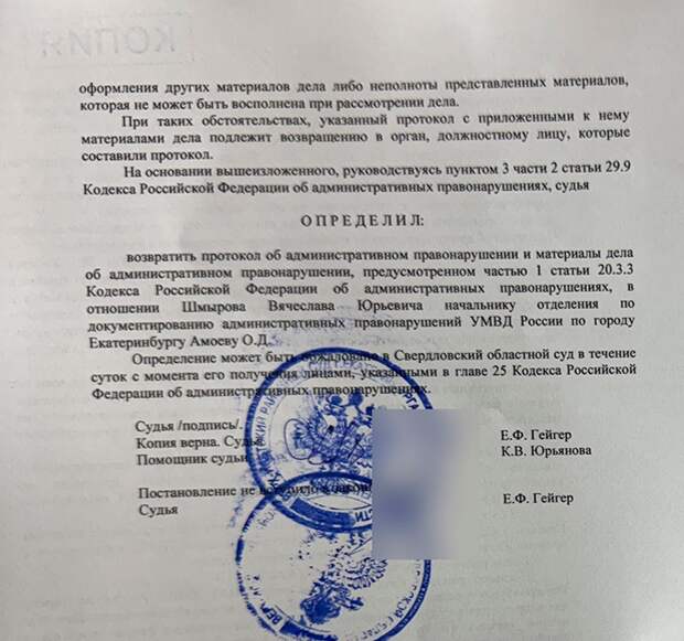 Судья, чтобы не подставиться потом на апелляции, достаточно благоразумно решила, что следует сразу вернуть протокол в полицию, чтобы не возникло юридических препон,