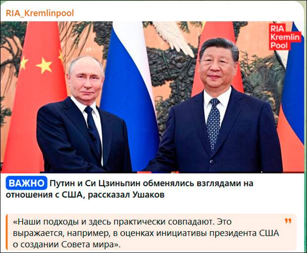 Оба пункта крайне важны. Они указывают на то, что Россия согласовывает тему "Совета мира" уж точно с Китаем, который в последний момент, как бы сквозь зубы, тоже получил от администрации Трампа приглашение поучаствовать в этом карманном ООН американского президента. Судя по словам Пескова - "от Кремля никто не планирует", - результат согласования отрицательный.