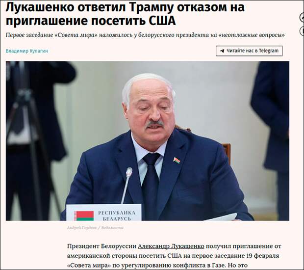Президент Белоруссии Александр Лукашенко, принявший было приглашение Трампа присоединиться к "Совету мира", тоже отказался от участия в его первом заседании. В Минске весьма тактично заявили, что очень благодарны за приглашение - но график Александра Григорьевича уже согласован и пересмотреть его нет, дескать, никакой возможности. Видимо, вспомнил Батька, как один экс-госсекретарь Союзного государства съездил в США и чем это для него кончилось.