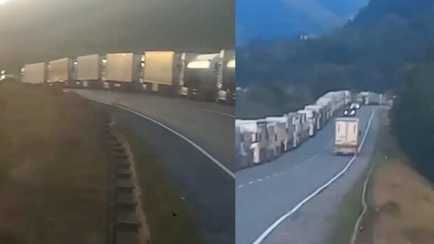 На видео в Сети можно видеть многокилометровую пробку из фур, которые просто не могут развернуться на узкой горной дороге.