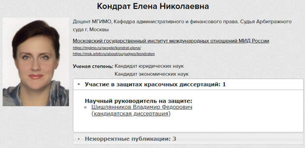 Бывшая судья Московского арбитражного суда Елена Кондрат - ей дали девять лет и тоже изъяли имущество на миллиарды рублей: торговый центр, земли и квартиры. Будучи судьей, она декларировала только право собственности на квартиру, где проживала с мужем и сыном. А изъяли торговый центр и дом площадью 525 кв.,м в Брянске, еще три квартиры, 17 участков земли и 19 нежилых помещений в Брянской области, в Крыму, в Москве и Истринском районе Подмосковья. Интересно и ее семейное положение: она жена Ивана Кондрата, который с 2004 по 2007 год занимал должность заместителя генерального прокурора России по Северо-Западному федеральному округу, а в 2007 году был назначен на должность заместителя генерального прокурора России по особым поручениям. Потом возглавил управление Федеральной регистрационной службы (ФРС) по Москве. С учетом, что супруг родом из Брянской области, где нашли недвижимость судьи, невольно возникает масса вопросов об уровне участия в этих схемах ее мужа.