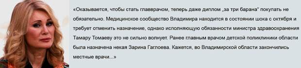 По информации из Сети, череда феноменальных назначений во Владимире началась после возбуждения уголовного дела против министра здравоохранения Валерия Янина. В виду полного отсутствия во Владимире заслуженных и квалифицированных врачей, на его место была приглашена Тамара Томаева, аж из самого Владикавказа.