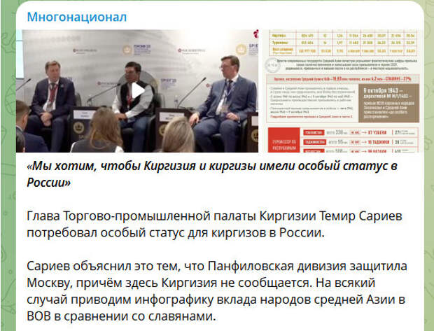 В "Многонационале" подчеркнули, что Сариев, рассуждая об особом вкладе Киргизии, опустил детали: например то, что "рука помощи", протянутая России в начале СВО, обернулась миллионами долларов, осевшими в киргизской экономике. Комментаторы отмечают: наглости в этих требованиях не занимать, ведь Киргизия и так уже пользуется целым рядом преференций.