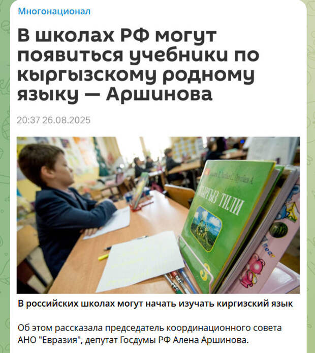 С Министерством просвещения РФ мы заложили такое предложение, как возможность создания учебника киргизского родного языка для российских школ. Можем это сделать со специалистами России и Киргизии. У нас уже есть подобные учебники по чувашскому, башкирскому, чеченскому языкам,