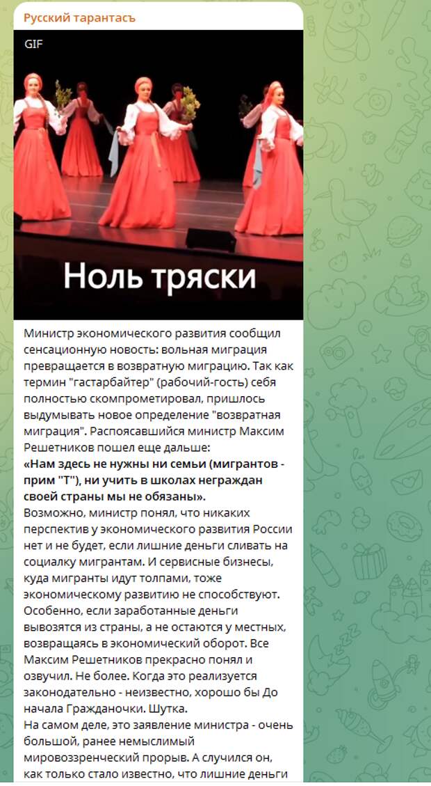 Возможно, министр понял, что никаких перспектив у экономического развития России нет и не будет, если лишние деньги сливать на социалку мигрантам. И сервисные бизнесы, куда мигранты идут толпами, тоже экономическому развитию не способствуют,