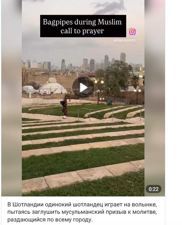 В Шотландии одинокий шотландец играет на волынке, пытаясь заглушить мусульманский призыв к молитве, раздающийся по всему городу.