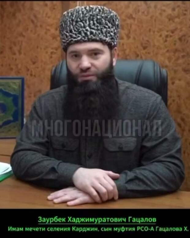 Заур Гацалов имам в селении Карджин и сын муфтия Северной Осетии Хаджимурата Гацалова. По его мнению группировка «Хамас», поддержавшая чеченских сепаратистов, (https://t.me/mnogonazi/21170) состоит из благородных людей, а «Братья-мусульмане»* (запрещенные в РФ) — вовсе не террористы.