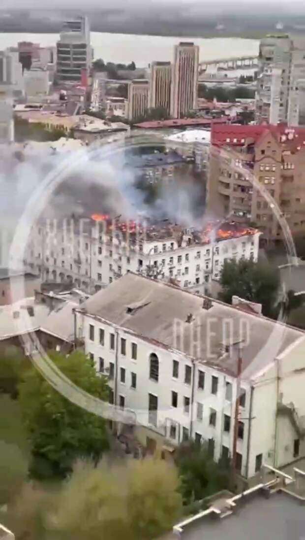 На видео запечатлена охваченная огнем крыша здания. При этом видно, что соседние здания не задело.