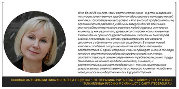 На сайте сказано, что представительства работают в Москве, Казани, Набережных Челнах, Новосибирске, а также в Дубае и Великобритании. Мы правильно понимаем, что в России действует целая сеть, вербовщики которой ведут охоту за русскими головами, и это не только не пресекается, а открыто пропагандируется? Основатель компании Нина Колташова гордится, что за 28 лет работы отправила учиться за рубеж более 17 тысяч детей, подростков и взрослых (как будто в России образование некачественное):