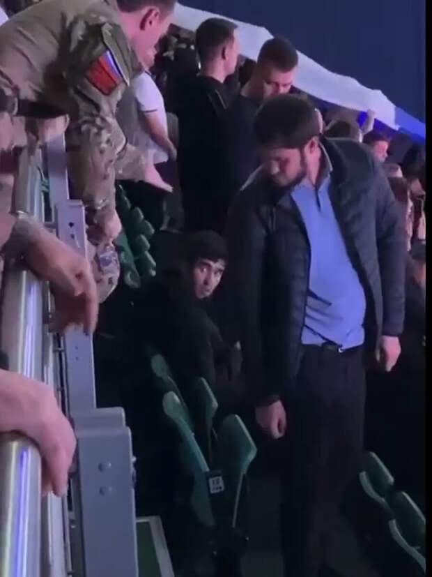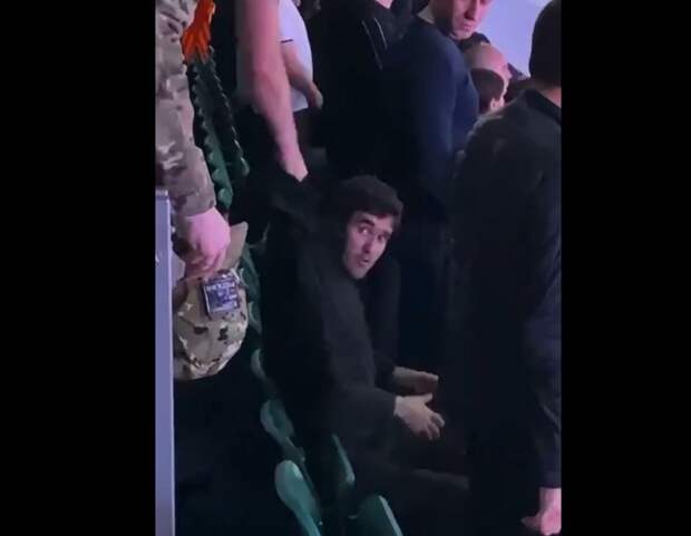 Один из зрителей, предположительно боец с СВО, не выдержав подобной наглости, хватает за шкирку приезжего и насильно заставляет его поднять пятую точку.