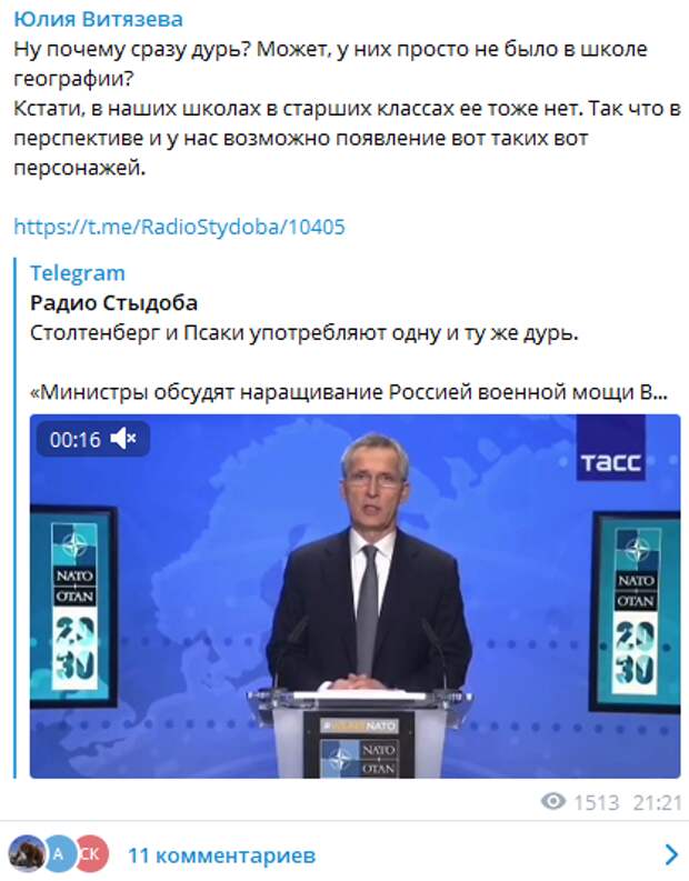 Слова руководителя западного военного блока о России, "окружающей" НАТО, смутили российских журналистов и блогеров. Telegram-канал "Радио Стыдоба" предположил, что Столтенберг и бывший пресс-секретарь Белого дома Джен Псаки "курят одну и ту же дурь". А Витязева предположила, что у главы НАТО просто плохо с географией.
