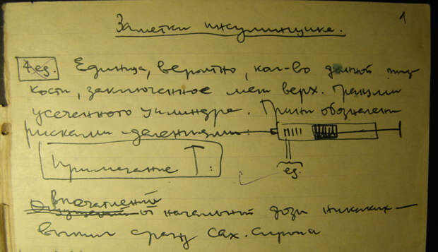 Дневник короткий – 17 желтоватых (от времени) вразброс листочков из тетради в крупную линейку заполнены только с одной стороны. Тетради скорее общей, а не школьной – ибо нет полей. Листки не слишком мятые, но видно, что их сгибали все сразу. Листки – каждый – пронумерованы цифрами в правом верхнем углу. Записи сделаны шариковыми ручками: чёрной, красной, зелёной и даже карандашом. Видно, что листки вырваны. Кое-где какие-то пятна, текст и без того не с идеальной каллиграфией в конце вообще разбегается по бумаге. Впрочем, сие понятно. Автор скрупулёзно записывал своё состояние после каждой процедуры с введением ему в организм инсулина. А состояние менялось от величины «дозы» И делал он записи, вероятнее всего, конспиративно. Как мог. И как получалось. Запись ведётся не по дням календаря – так что время года курса «лечения» не установить – а по дозам из шприца в «единицах» наполненности этого самого шприца. После уколов ему давали пить сахарный сироп… вводили глюкозу…