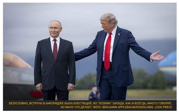 Уже ведь понятно, что происходит. В Анкоридже состоялась блестящая встреча Путина с Трампом. Президенты двух стран о многом договорились — о большем, чем официально объявлено. Обе стороны вроде как идут на уступки. Но Путин отвечает за себя, поэтому: сказано — сделано. А Трамп — за весь Запад и Киев. Но в результате: сказано — и… не сделано.