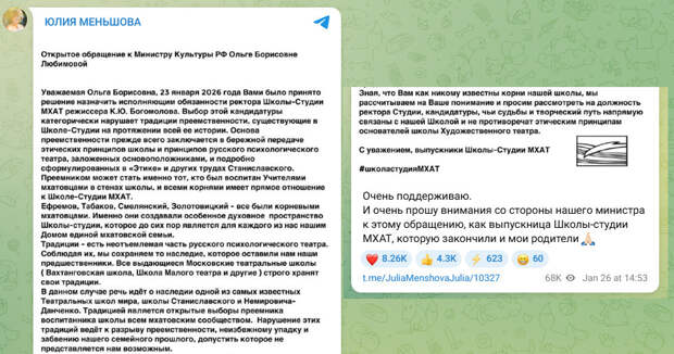 В своём обращении они попросили министра культуры Ольгу Любимову, хорошо знакомую с корнями школы, рассмотреть и другие кандидатуры на должность ректора студии. И это должны быть люди, чья судьба и чей творческий путь связан с этим вузом, а также не противоречит этическим принципам основателей школы Художественного театра.