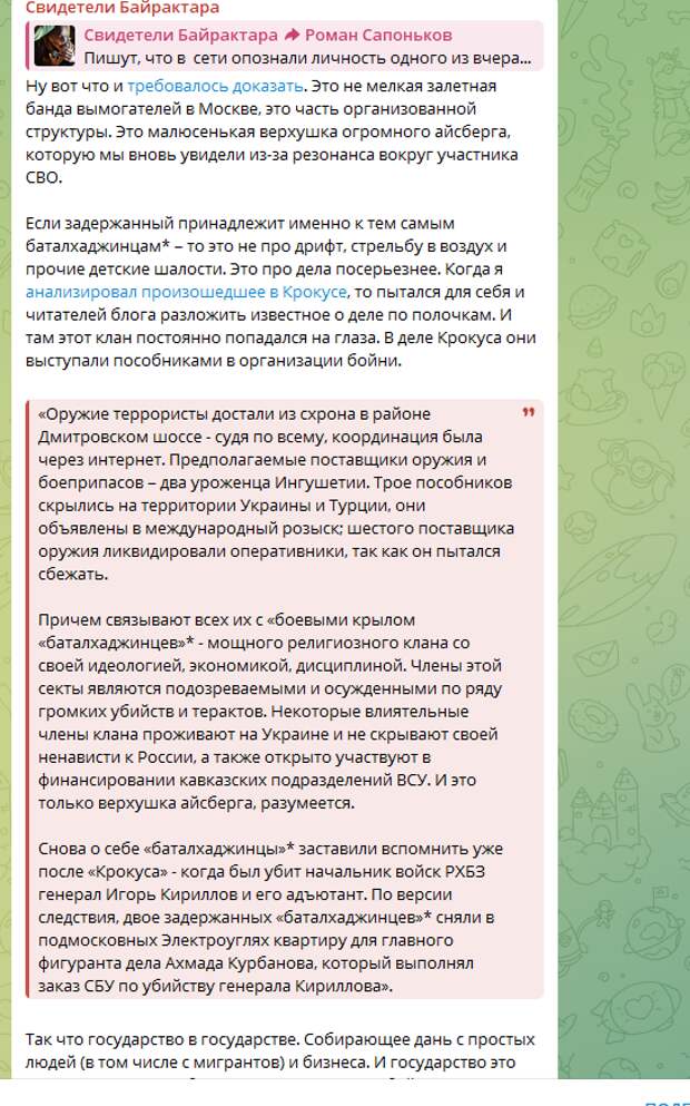 Но самое интересное, что "баталхаджинцев"* считают пособниками в самых громких преступлениях прошлого года: в теракте в подмосковном концертном зале "Крокус Сити Холл" и подрыве в Москве командующего войсками радиационной, химической и биологической защиты (РХБЗ) ВС России Игоря Кириллова.