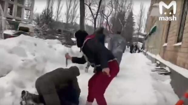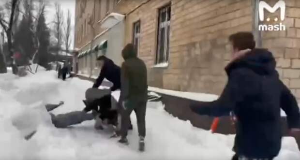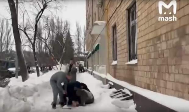 Дочь Анны снимает всё на телефон с криками ужаса. Один из агрессоров замечает съёмку, пытается вырвать гаджет, оскорбляет девушку.